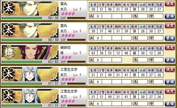 落ち着け……落ち着け……落ち着けなくて久々に画像投稿しちゃったよ……見てくださいようちの本丸にようやく蜻蛉切が来たんですよ……ずっと仲良しこよしでお隣同士、時々来派や光忠が挟まっては去り挟まっては去りを繰り返していたLv.1鶯氏ご一行とLv.1江雪お兄様ご一行の間に、蜻蛉切が来たんですよ……!!なお来派の明石はもちろん実は蛍丸きゅん2本目すらまだ来ておりません……え、と、蜻蛉切!?蜻蛉切って何だっけ!?実在していたの!?え!?ちょっとまって落ち着くの無理