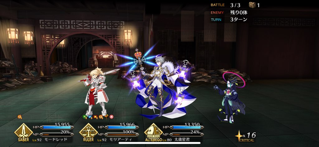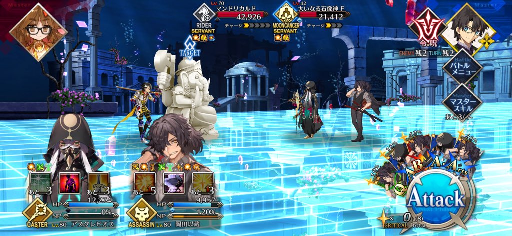 聖杯戦線、弊カルデアでは岡田が無双しておりモニターで見てる龍馬がニッコニコなのですが、特に昨日はこのダーオカ&アスぴ先生でずんずん突き進み次々と相手を切り刻んでいったので爽快だった。上の方にいた敵は全部以蔵さんが宝具とクリティカルで捌いてくれたしアスクレピオス先生ともかみ合ってて最高だった。聖杯入れてるとはいえ2人とも星3なのに優秀!!つよい!!かっこいい!!ありがとう!!ケイローン先生もにっこり。龍馬は後方幼なじみ面だけどケイローン先生は授業参観だな