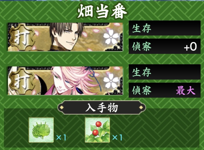 採れどきの木苺の選別がめちゃくちゃ上手な宗三と、そのへん良くわかっておらず宗三に負けてるのが悔しくてぐぬぬとなりながら大葉をちまちま摘む長谷部、いつも収穫ありがとう、でもそろそろ生存を上げてほしいな…!?この2振ぜんっぜん生存上がらない、2振でわーわー言い合いしてる間に勝手に来た江雪お兄様と付いてきたお小夜がさっさと仕事こなしてくれてるから説はある。生存上げるアイテムが欲しい私VSこのゆるゆる感が良いんじゃろがい!と思う私VSダークライ