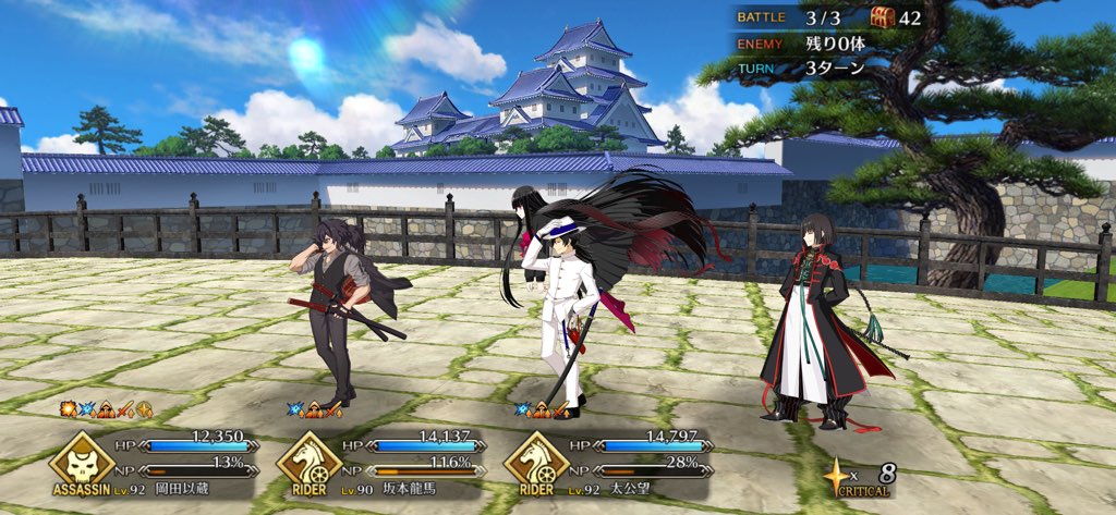 ところで今回のイベントで弊カルデアは岡田に感謝の聖杯追加キメたんですけど、こうなってくるとますます騎龍馬のコインが欲しくなってくる…!汎用コインってそんなにダメかな…!?周年イベントで実装されませんか!?騎龍馬をもっと強くしたい…!しかし騎龍馬も槍龍馬もスキルの全体バフが岡田とかみ合ってるのほんと可愛くて好き。昨日更新のわからない、初登場の帝都コラボから問題発言連発の鳴鳳荘イベ等数々のイベントを経て危機一髪へと至った坂本龍馬の幼なじみ大好きパワーがスピンオフでも爆発していてとても良かったです。土佐トリオの可愛いところ、何だかんだでお竜さんとイゾーが仲良いところ
